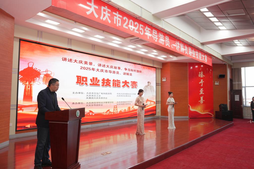 11月9日,2025年大庆市导游员、讲解员职业技能大赛比赛决赛在大庆师范学院图书馆博雅讲堂举行。本次大赛由大庆市文化广电和旅游局、中共大庆市委社会工作部、大庆市总工会、大庆市妇女联合会、共青团大庆市委员会联合主办,大庆师范学院经济管理学院、大庆市传统文化协会、大庆市导游协会、大庆市旅行社协会共同承办。