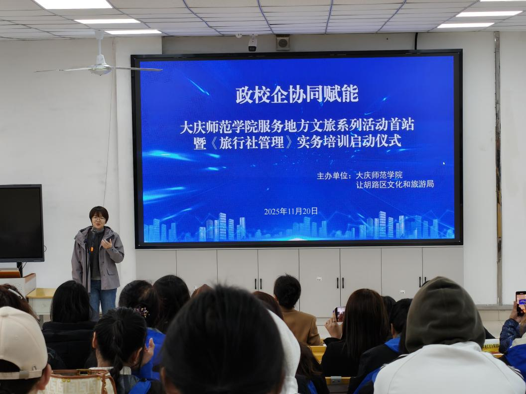 2025年11月20日上午,“政校企协同赋能:大庆师范学院服务地方文旅系列活动首站暨《旅行社管理》课程实务培训启动仪式”在我校主楼1-2教室隆重举行。让胡路区文化和旅游局局长王亚楠、副局长张文臣,我校产教融合协同创新中心主任徐永胜、经济管理学院院长刘楠、副院长邬德林、旅游管理系主任车鑫以及黑龙江亚山国际旅行社有限公司、黑龙江省见闻有趣旅游有限公司、大庆新青年国际旅行社有限公司、大庆假日研学国际旅行社有限公司、大庆市百湖假日国际旅行社有限责任公司、黑龙江尼尔斯国际旅行社有限公司、大庆中国国际旅行社有限公司东湖门市部等企业代表出席活动。活动由经济管理学院实践教学中心主任邹成成主持。